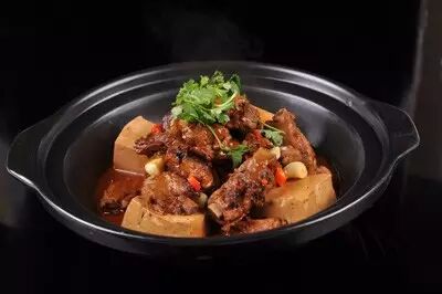 2、鍋入植物油燒至五成熱,下薑片煸香,再下入豬排炒幹水分,放八角、桂皮、整幹椒、白蔻,烹入料酒炒香,然後倒入鮮湯,旺火燒開後撇去浮沫,加入鹽、味精、雞精、蠔油、糖色調好顏色與味道,轉小火燒至排骨軟爛。